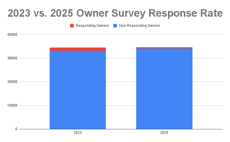 The chart shows the proportion of Owners who responded to the 2023 and 2025 Owner Surveys. We received 493 surveys by the end of March, 2025; at that time we had 34,069 active Owners, so 1.4% of active Owners completed the survey. This number is far lower than the 3.6% response rate for the 2023 Owner Survey, despite a similar amount of promotion. We will be making improvements to how we communicate about the 2027 Owner Survey.