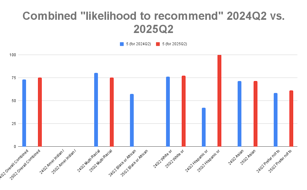 Our goal for this one is for all BIPOC groups to meet or exceed the overall percentage. We did not achieve our goal in this quarter compared to 2024Q2. (Customers identifying as multi-racial rated us slightly lower than in last year’s second quarter.)