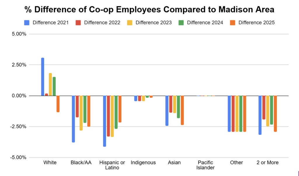 WSGC Employee Racial demographics % difference compared to Madison Area as of December 31st of each year for 2021-2024; 2025 data is as of June 30th.