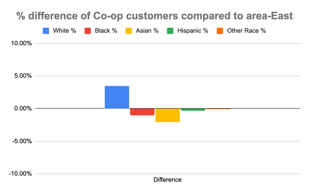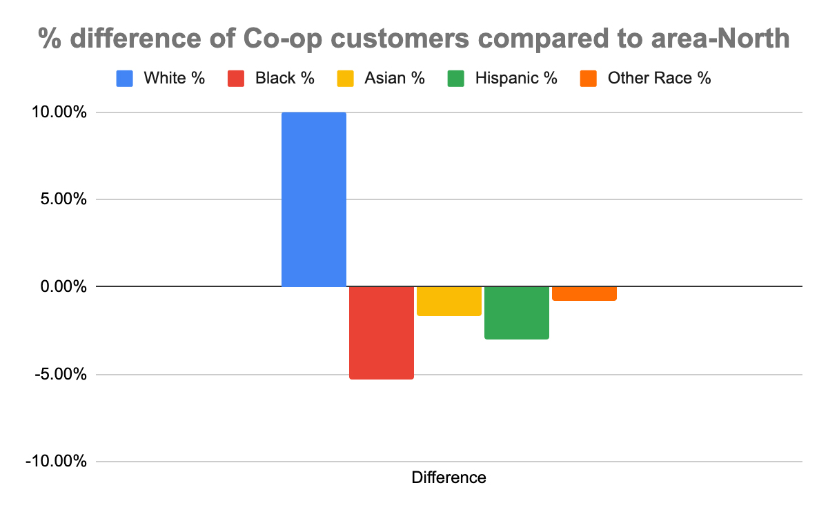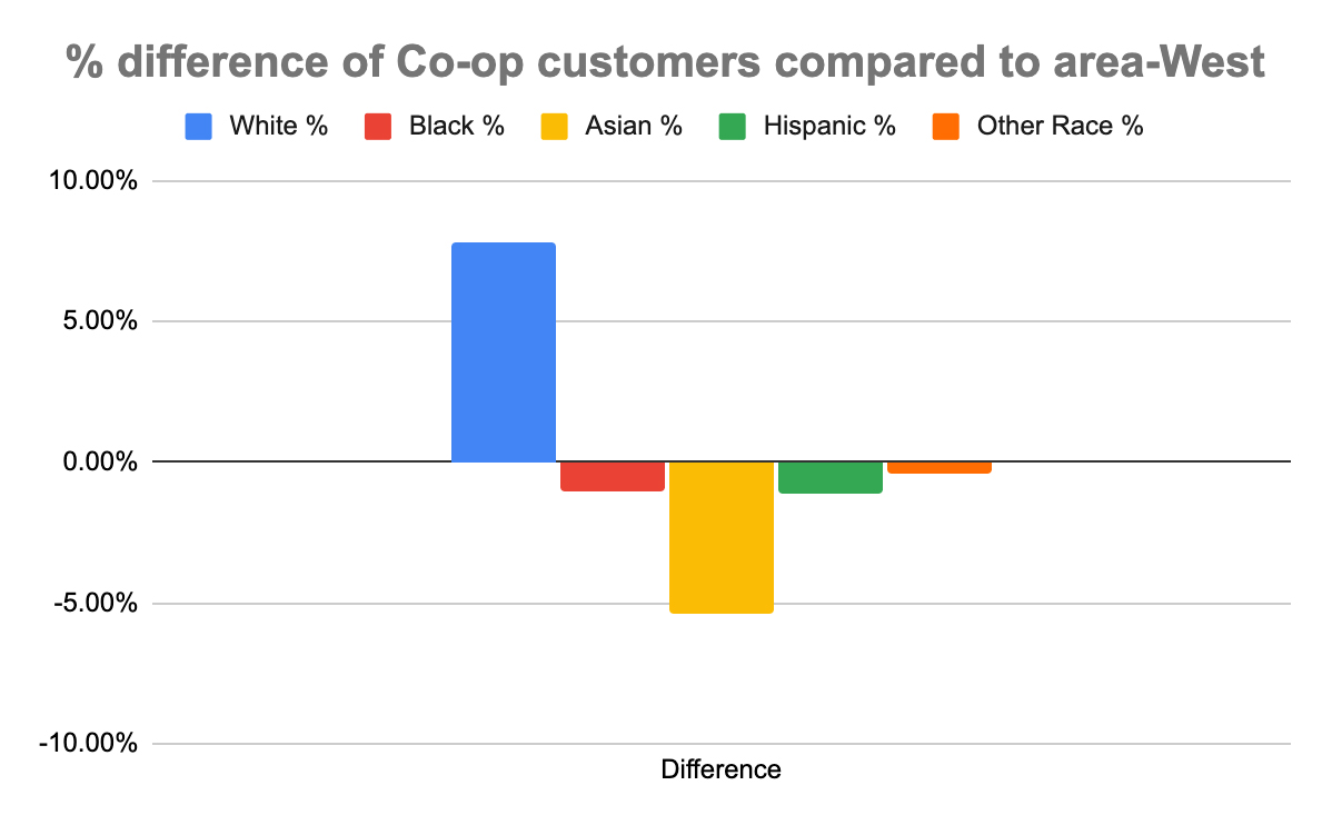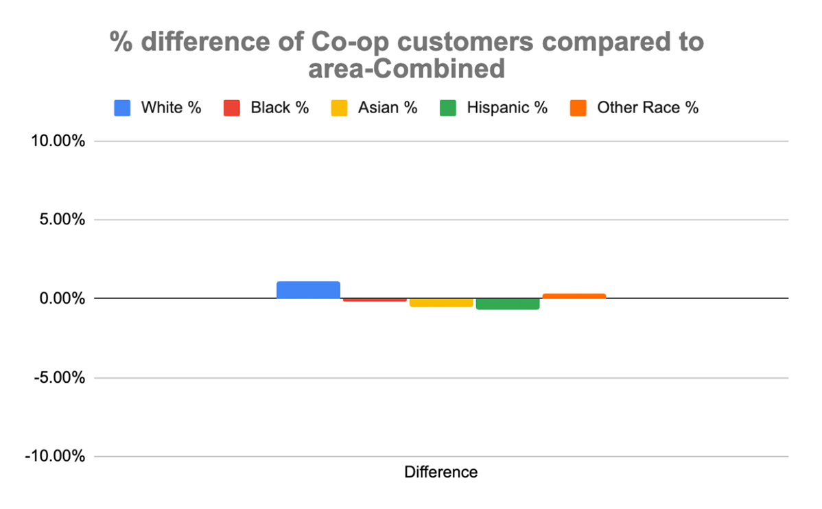 In each chart, the 0% line represents the race/ethnicity of each group in the given trade area; the bars show by what percentage our Co-op customer demographics are above or below. In other words, where are we over- or under-represented by race/ethnic group and by how much?
