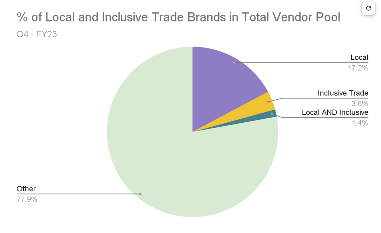 Our goal is to increase the number of Local and Inclusive Trade vendors and products we carry.  Prior to the implementation of the Inclusive Trade program we had not tracked demographic information for our vendors. We’re planning to update this information annually.
