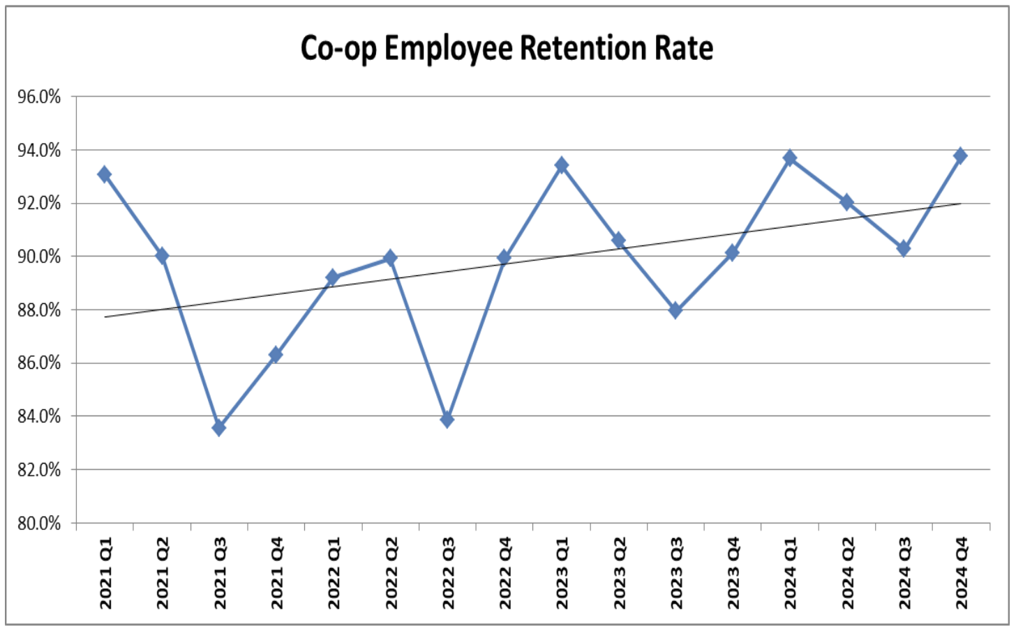 The Co-op wants our employees to stay with us and continue to grow. To evaluate how many employees stay at the Co-op, we analyzed the employee retention rate.