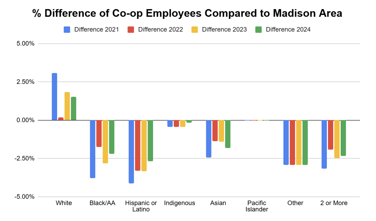 WSGC Employee Racial demographics % difference compared to Madison Area as of December 31st of each year for 2021-2024; 2025 data is as of June 30th.