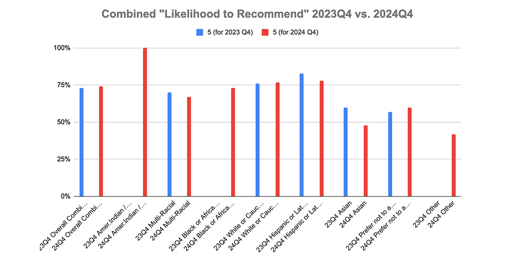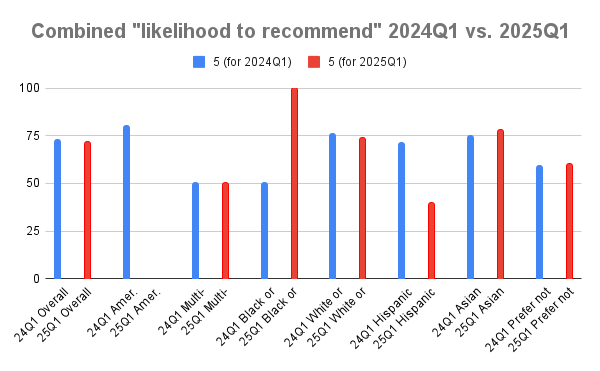 Our goal for this one is for all BIPOC groups to meet or exceed the overall percentage. We did not achieve our goal in this quarter compared to 2024Q2. (Customers identifying as multi-racial rated us slightly lower than in last year’s second quarter.)