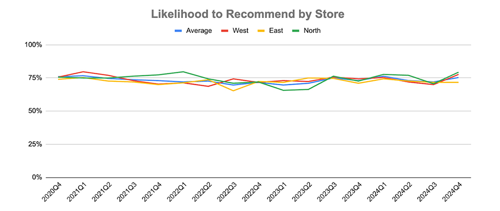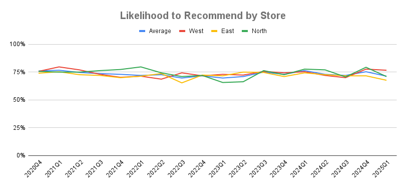 Likelihood to recommend by store. Combined: 75% West: 78% East: 74% North: 73%