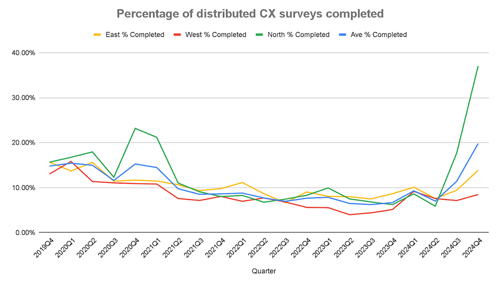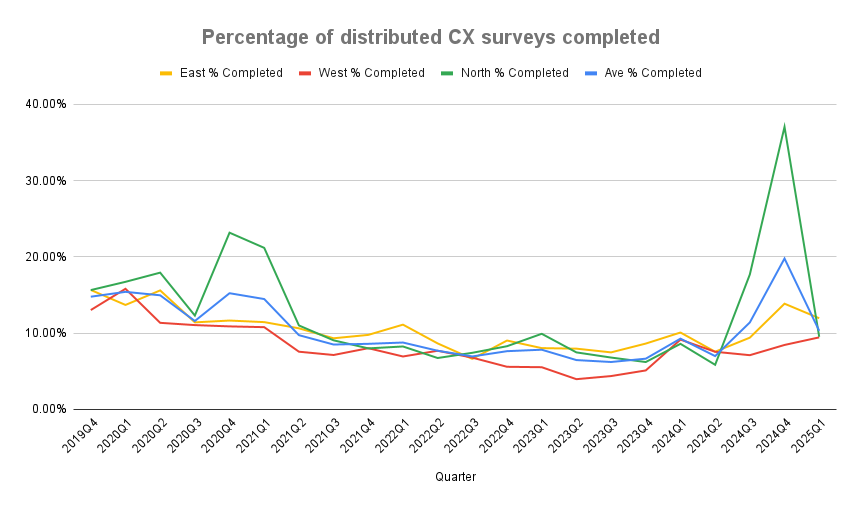 Percentage of distributed CX surveys completed. 2025Q2 East: 9.37% West: 9.15% North: 10.18% Overall: 9.57%