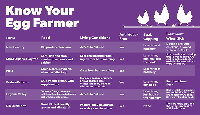 Organic Valley | Egg whites | Wisconsin | Balanced diet with corn/soy and additional nutrients. Omega layers get additional flax. | Access to outside. | Yes | Laser trim, just hook at the hatchery. | May use antibiotics on sick birds; eggs from these birds are no longer certified organic, so they will not be sold. |