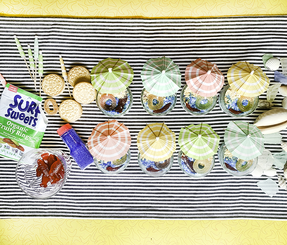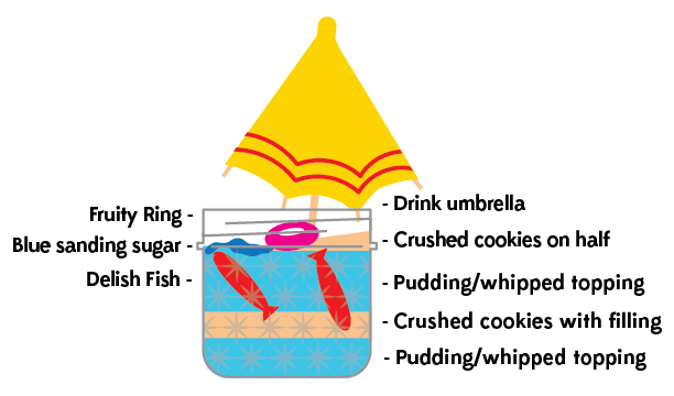 5. To each jar add a few Delish Fish and sprinkle half of the top with the crushed cookie tops (sand). Sprinkle some blue sanding sugar along the edge where the water meets the sand. Then add a Fruity Ring and a paper umbrella and DIVE IN!