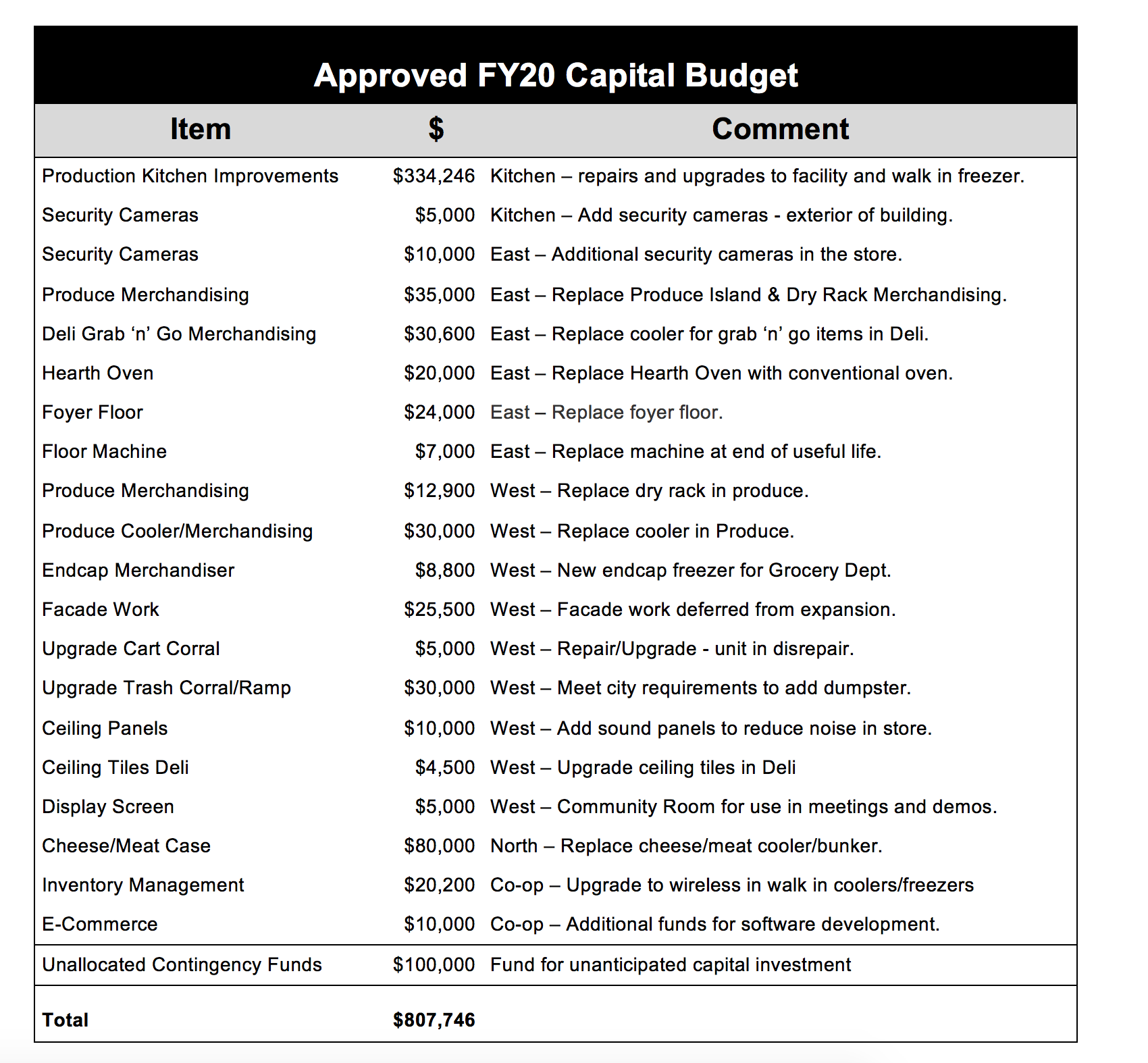 If you have any questions regarding the FY20 budget, feel free to email me at p.wickline@willystreet.coop.