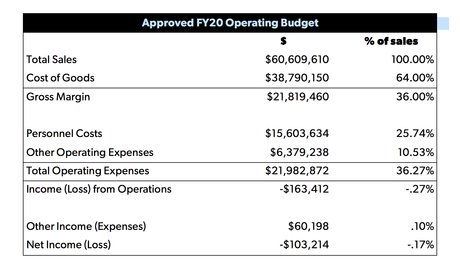 This is the fourth year in a row we are budgeting for a loss. We had originally expected to have positive net income in FY20 following three years of losses after opening Willy North. The expansion project at Willy West which was completed in FY19, will result in another year of operating losses. Operating expenses increased due to the expansion. These expenses include additional rent, utilities and depreciation/amortization expense for the equipment and construction costs. We anticipate it will take another year for our sales to grow enough to cover the additional expenses.