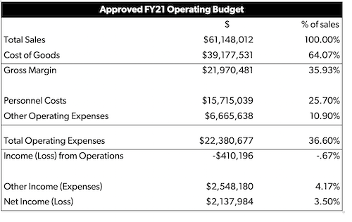 Our operating budget shows a loss from operations of $-410,196 and other income of $2,548,180, bringing us to net income of $2,137,984. The other income includes the accounting entry to record the forgiveness of the $2.5 Million personal paycheck protection (PPP) loan we received in April 2020.