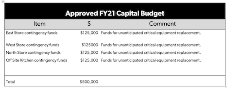 The FY20 approved capital budget is $500,000. These funds were approved to be used to replace any critical/essential equipment that may need to be replaced or is needed to expand online shopping. All optional upgrades have been put on hold until after the pandemic.