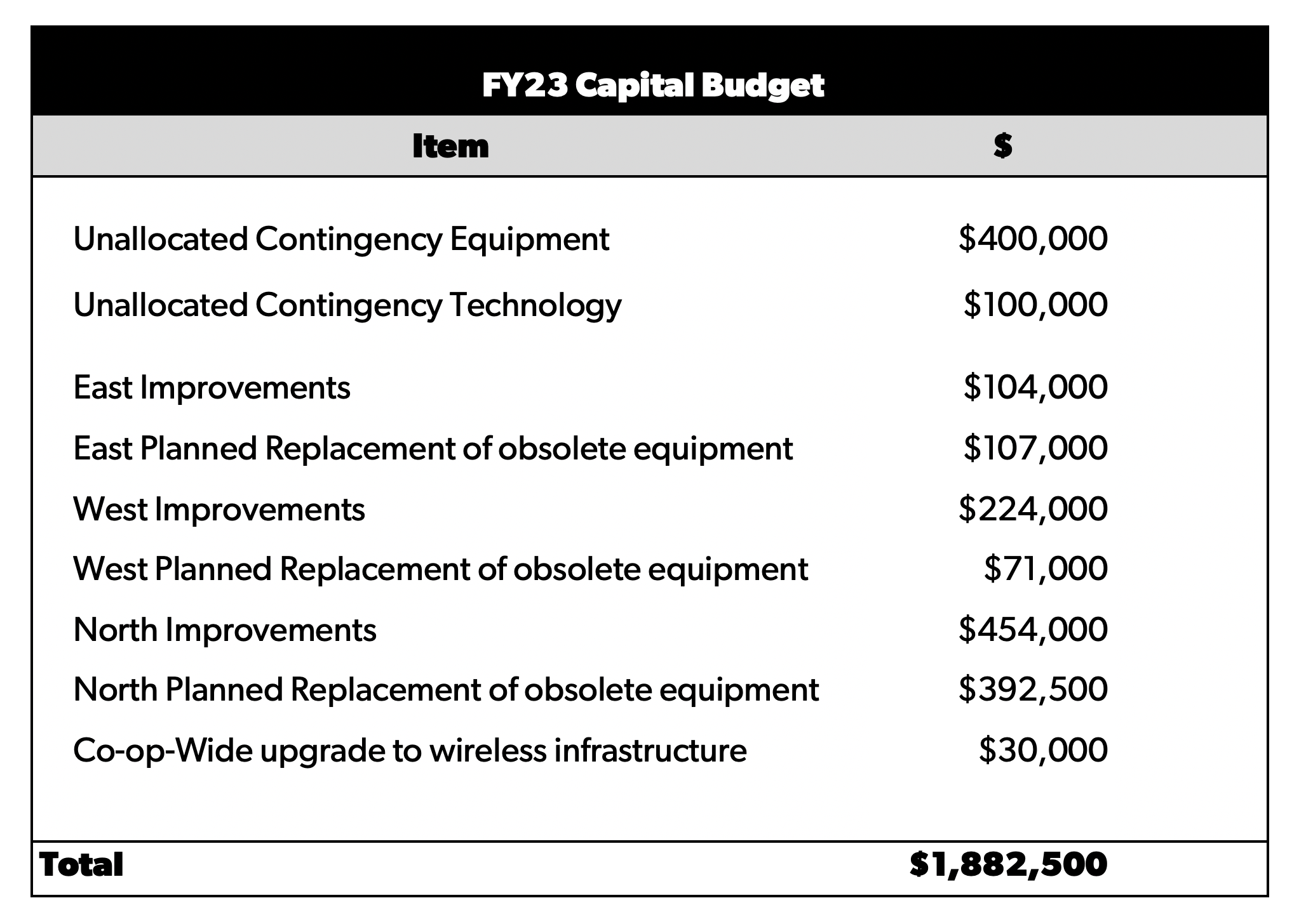 The FY23 capital budget is $1,882,500. These expenditures take into account a lead time for equipment delivery of up to 18 months. Many of these projects will not be complete in FY23 but the expenditure approval allows us to order equipment that will be available later in calendar year 2023 and early 2024. Some of the upgrades are related to minor reconfigurations of the interior of our retail locations to improve your experience as you shop the stores.