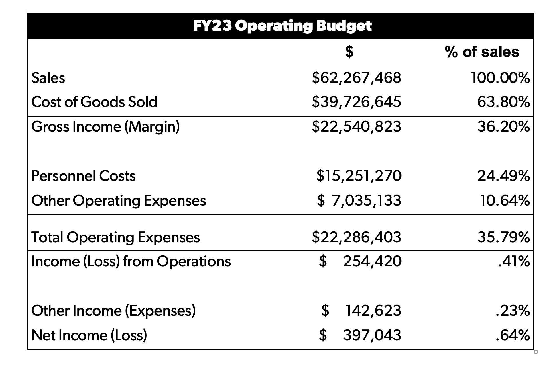 Income From Operations. Our income from operations is budgeted at $254,420 or .41% of sales. This is down from the previous fiscal year 2022 income from operations of $1,044,717 or 1.73% of sales. The difference in income from operations is primarily due to increased costs of labor and other expenses as the result of inflation.