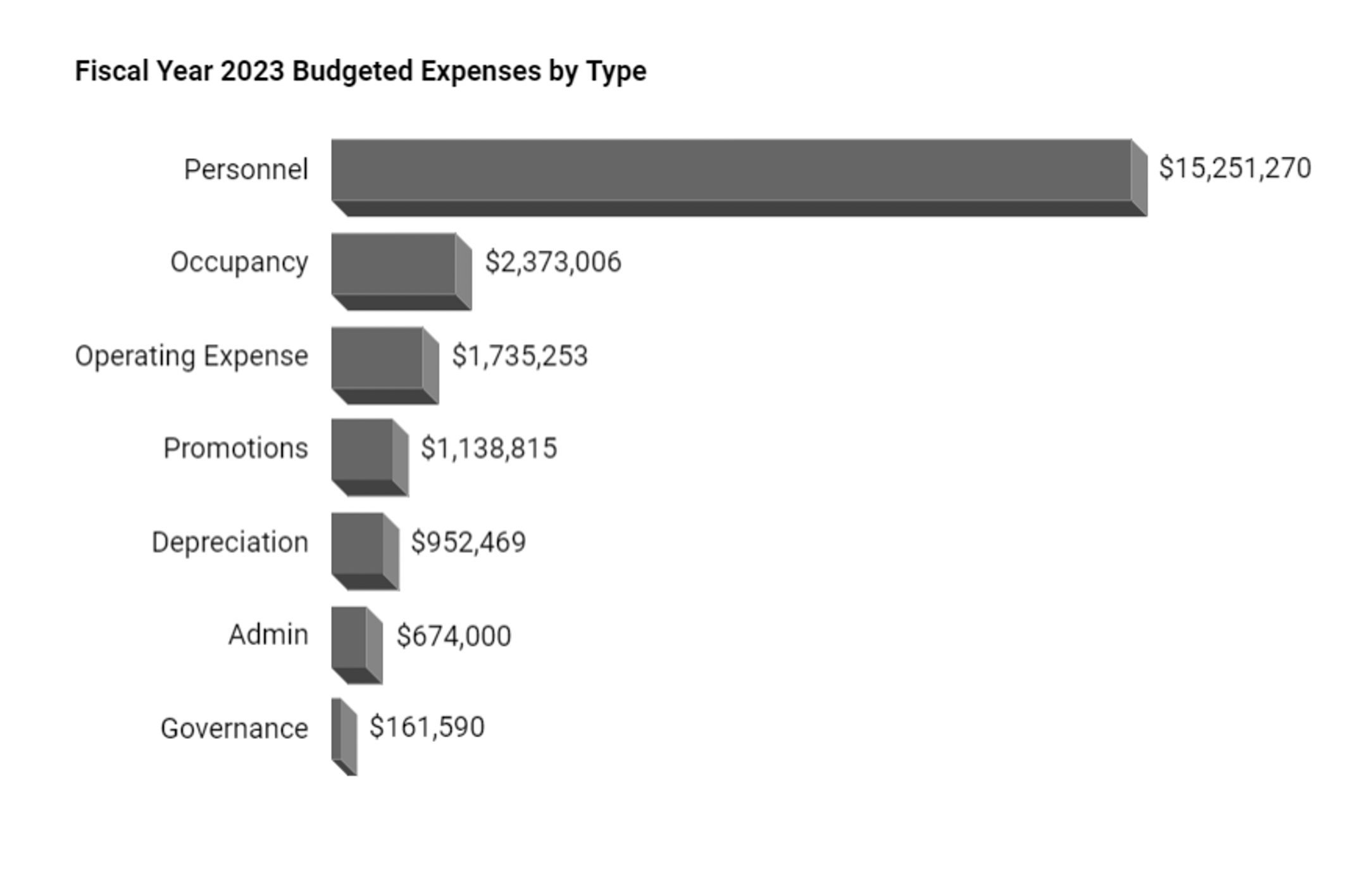 Personnel. Personnel expenses include wages for worked hours, paid time off, and benefits. These costs are budgeted to be 24.49% of sales, which is slightly higher than FY22 wages and benefits. This increase is primarily due to wage increases for staff.