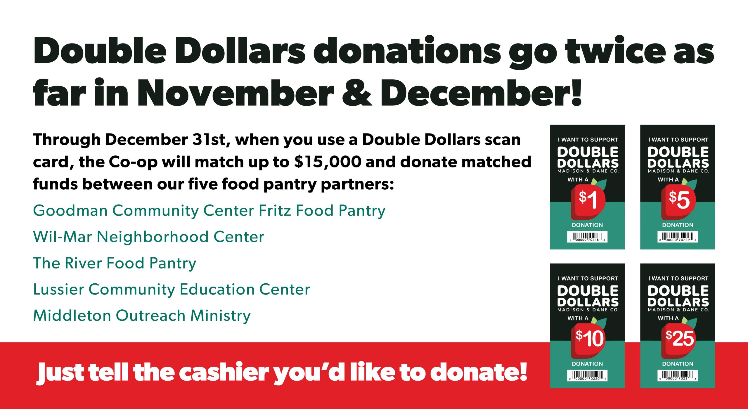 We are halfway through our two-month matching campaign to support the Double Double Dollars Fund and our five partner food pantries: Goodman Community Center Fritz Food Pantry, Lussier Community Education Center, Middleton Outreach Ministry, The River Food Pantry, and Wil-Mar Neighborhood Center. There are two simple ways to participate: Donate to Double Dollars using the $1, $5, $10, or $25 scan cards at the cash registers; or reuse bags for packing your groceries at checkout. Whenever you reuse a bag, we record 10¢ that we would have spent on a paper bag and instead contribute all those saved dimes to the Double Dollars Fund. When you support Double Dollars this November and December, we will match up to $15,000 to provide gift cards for our local food pantries to use to purchase fresh foods that are not as easy to get in the winter months. This is a $5,000 increase from last year to help relieve the effects of the pandemic over this time. As of this writing, the November part of the campaign was off to a great start, with $4,279.10 for Double Dollars, and $4.279.10 for our food pantries. Let’s keep it up, and end the year off, propelling our community food needs in the right direction.