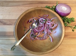 Directions: Combine vinegar, 1/2 cup water, sugar, salt, and garlic in a 16-ounce jar; cover with lid. Shake until sugar is dissolved. Add onion, cover with lid, and let stand for at least 20 minutes. Onion can be pickled and refrigerated up to 2 weeks. Just before serving, drain onion and toss with cilantro and oil.