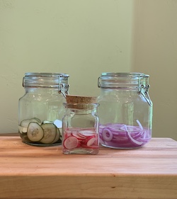 I tried two different styles of quick pickling, and found that both turned out to have subtle differences in flavor and were absolutely delicious. The first style of brine I used was apple cider vinegar and the second style used unseasoned rice vinegar. I chose some basic vegetables: red onion, cucumbers, and radish and jarred them separately. Almost any vegetable will work for quick pickling. Some of the most common are carrots, green beans, asparagus, peppers, cauliflower and beets.