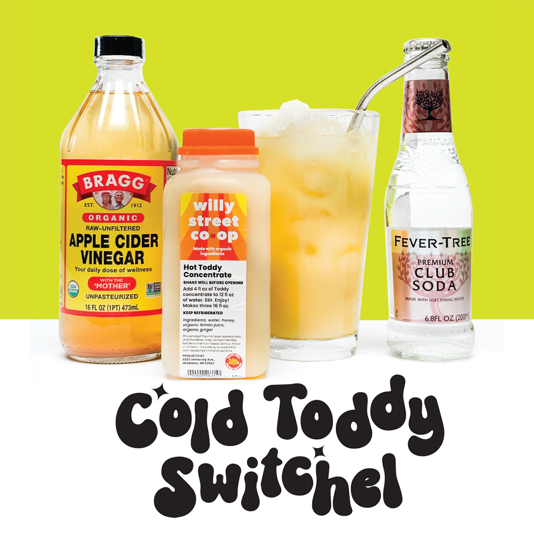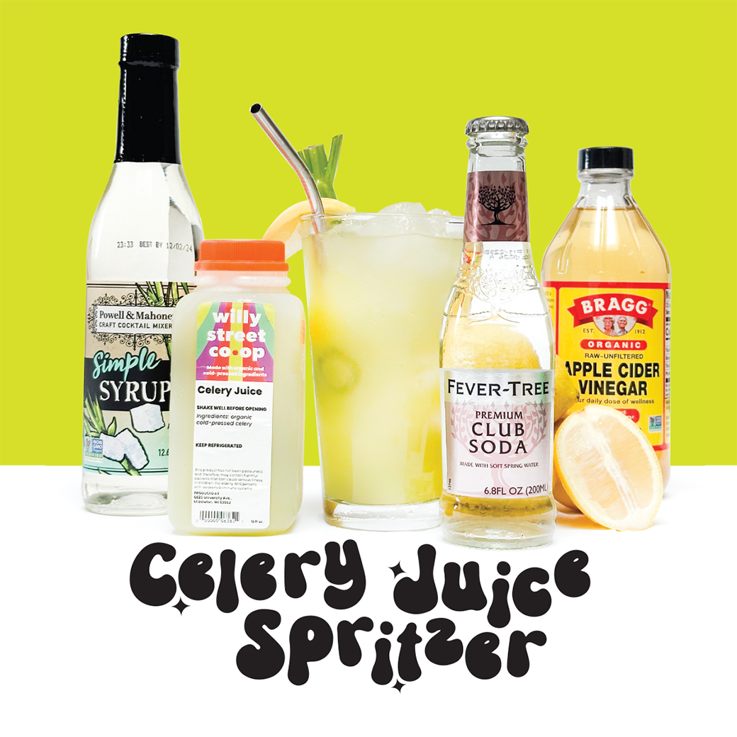 Fresh off our cold press juicer, the Co-op’s selection of juices provides many thirst-quenching possibilities. These are perfect for creating a flavorful refreshment for the backyard barbecue. Stock up on celery juice this July as the foundation for your summer beverages. Just combine a bottle of Willy Street Co-op Celery Juice with simple syrup (to taste) and a teaspoon of lemon juice. If you’re feeling adventurous, steep this concentrate with some sprigs of dill. Once strained and ready to serve, pour over ice about until half your glass is full and add a splash of apple cider vinegar. Top it off with club soda, tonic, or your favorite carbonated water and you are ready to enjoy.