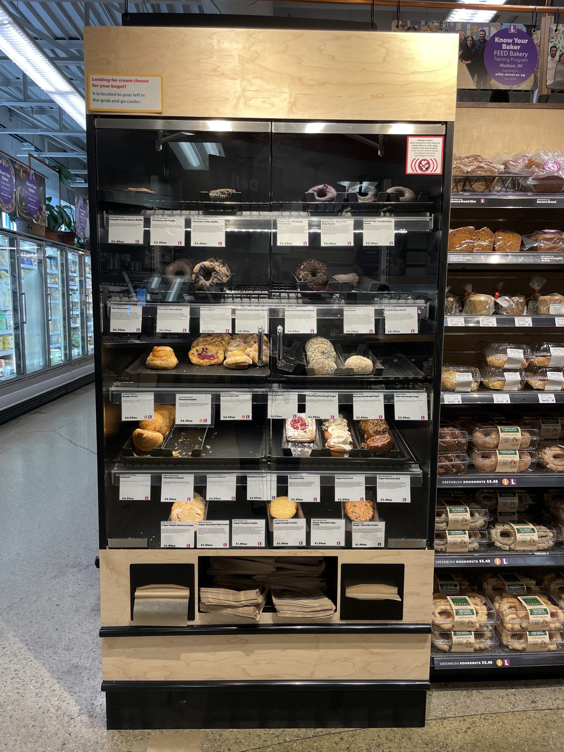 During COVID, we began wrapping all of our pastries in plastic, but we (and many customers) did not like so much single-use plastic being used. We reintroduced the bakery case with non-wrapped pastries at Willy East, and now you can get your Level 5 Donuts, Far Breton Bakery pastries, and Madison Sourdough croissants, danishes, and pain aux raisins sans plastic. We plan to bring back the bakery cases at Willy West and Willy North later this month.