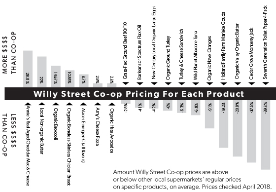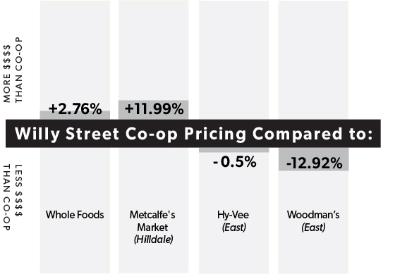 Below are some of the findings from our most recent price comparison, which took place in March 2018. We compared a total of 147 of our top-moving items from all departments of the store against the pricing at four of our main competitors: Whole Foods, Metcalfe’s Market (Hilldale location), Hy-Vee (East Washington Ave. location), and Woodman’s (East location).