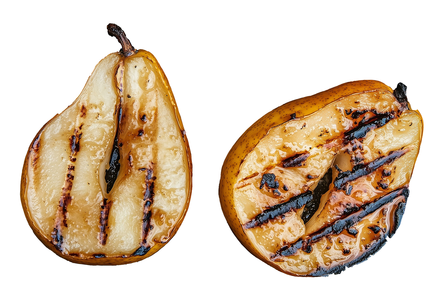 I like basting apples and pears with a little maple syrup a couple of times after the first flip, and adding a dollop of goat cheese to the hollowed out center, and sprinkling crushed, salted candied pecans over the top before serving. A kiss of smoke early in the grilling process takes grilled stone fruit, apples, and pears to the next level!