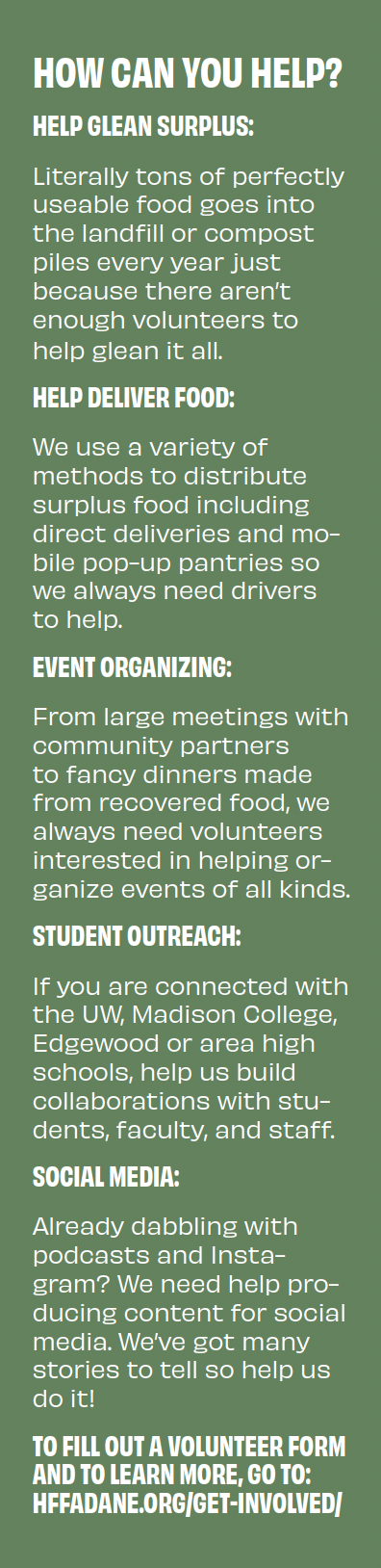 Since the pandemic, HFFA has assumed responsibility for two longtime food recovery projects that needed greater organizational support. We now lead the collection of surplus produce at the Dane County Farmers’ Market which generates many thousands of pounds of fresh produce every season. We also now maintain a Retail Gleaners Network of volunteers who collect surplus from groceries and other retail outlets across Dane County.
