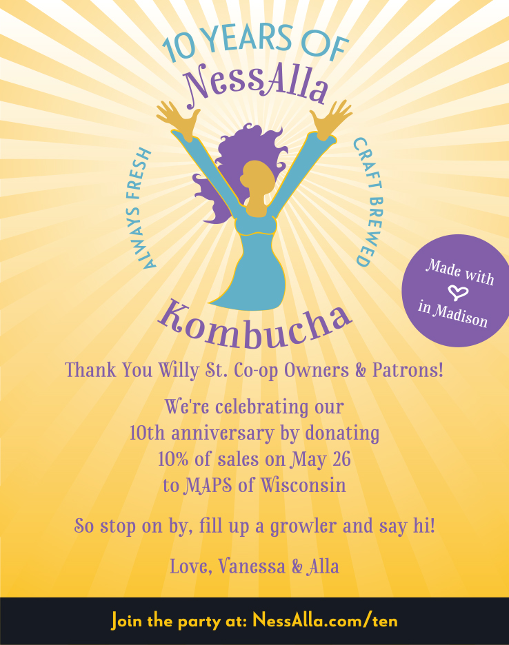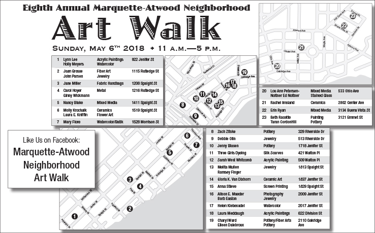 newspaper ad for the 8th annual Marquette-Atwood Neighborhood Art Walk Sunday May 6th 2018 10 Years of NessAlla Kombucha - nessalla.com/ten