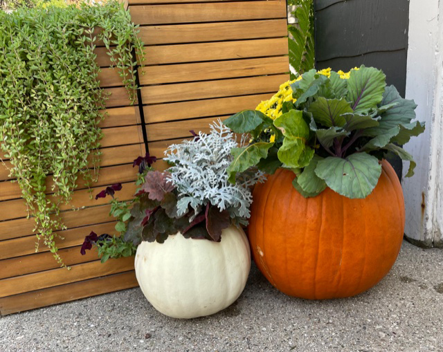 As we shift into a more comfortable season, I wanted to find a way to create some curb appeal that would express my love for fall and gardening by planting ornamental kale, cabbages, chrysanthemums or a variety of edibles in homemade pumpkin planters. This was pretty easy and my little helpers were excited to be involved and get their hands dirty.