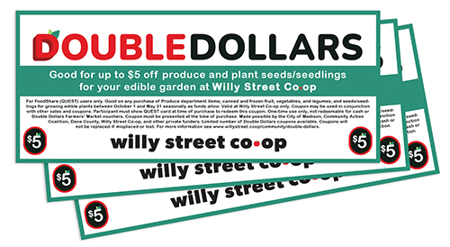 As the Double Dollars season at the farmers’ markets winds down, it is starting up again at the Co-op! If you are a shopper using FoodShare/QUEST from the Supplemental Nutrition Assistance Program (SNAP), then you qualify to participate. Double Dollars is a nutrition incentive program created to help those using FoodShare/QUEST purchase fresh, canned, or frozen fruits, vegetables, and legumes. In addition, seeds and seedlings are eligible in this program for growing edible plants. On Tuesdays from October 18 through March 7, any shopper using their FoodShare/QUEST card to purchase groceries will be eligible to receive up to $20 worth of Co-op Double Dollars vouchers. Vouchers are issued at the registers once your initial order has been completed. For every $5 you spent using FoodShare/QUEST for any FoodShare/QUEST eligible items, the Co-op will give you one $5 Double Dollar voucher, up to $20 per Tuesday. Co-op Double Dollars are redeemable any time the Co-op is open October through May while funds are available. If you have leftover Co-op Double Dollars vouchers from last year, you can start redeeming them right away on October 1. For further questions on the program, please visit our Double Dollars page.