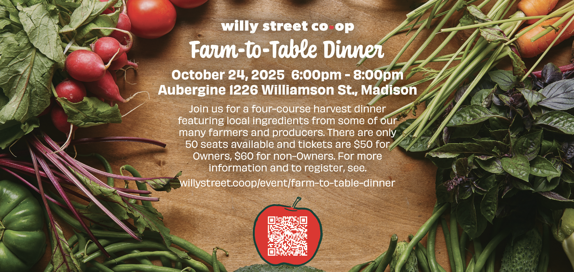 Join us for a four-course harvest dinner featuring fresh ingredients from some of our local farmers and producers. Included on the menu will be cheeses from Hidden Springs Creamery of Westby, pasture-raised pork from Fox Heritage Farms, produce from Lovefood in Stoughton, apples from Ela Orchard, and many more local products. There are only 50 seats available, and tickets are $50 for Owners, $60 for non-Owners. See the menu to the right (courses and ingredients are subject to change based on seasonal availability). Please note the cancellation and waitlist policy on our registration form, which will be strictly followed.
