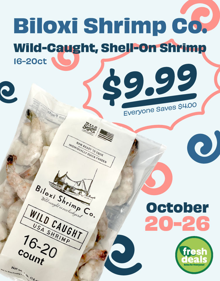 While our offerings tend to vary slightly from store to store, there are a couple “core” items that are available year-round that are responsibly sourced from either a wild fishery or aquaculture farm. Niceland Icelandic cod loins are offered at all three Co-op locations, and are some of the most environmentally sustainable and responsibly-sourced wild seafood available. Certified sustainable by the MSC, the packaging on this fish includes a QR code that allows the purchaser to trace the fish through the supply chain. This level of transparency and traceability, on top of the quality and consistency, makes it a top choice for anyone looking for a great protein option. Another great option available at all stores is Biloxi Shrimp Company’s Gulf shrimp. Wild-caught off the Gulf Coast of the U.S. and processed in Mississippi, these are some of the best-tasting and responsibly caught domestic shrimp available. Look for one-pound bags in various sizes in the freezer section.