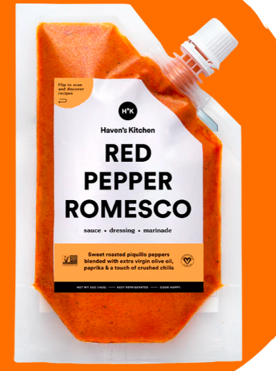 - Red Pepper Romesco—Roasted sweet Piquillo peppers and Calabrian chilis gives this sauce a bright red-orange color and peppery zest, without being very spicy-hot. One of the serving ideas on the back of the package was to toss with pasta, so I grabbed the best pasta there is—some fresh, locally-made egg campanelli from RP’s Pasta Company. I prepared the pasta according to the directions on the package, then tossed it with around two teaspoons of this sauce. I added in some steamed zucchini on the side, because, let’s face it—we’re swimming in zucchini right now—and topped it with some shredded asiago cheese. It was a tasty summery pasta dish. You can also use this sauce on sandwiches and as a marinade.