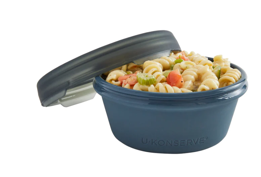 Handy new food storage containers from UKonserve! Durable silicone makes these safe for use in the microwave, dishwasher, and freezer. Featuring a leak-proof dual seal lid which allows venting during reheating. Perfect for school lunches! Available at all stores.