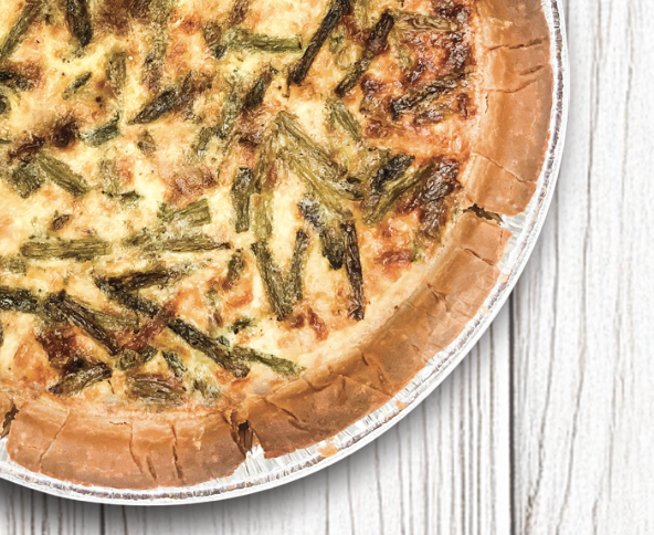 Preheat the oven to 375°. Begin by preparing the veg for the filling. Wash the asparagus spears and remove the woody ½ -1” at the ends. If the spears are very thick, you may want to peel the last inch or so to remove the toughest outside layer. Cut the asparagus into ¾-1” pieces and toss with the onions, olive oil, salt and pepper, and spread in an even layer on a sheet pan. Roast the vegetables in the oven until the asparagus is just tender and everything is browning on the edges. Set this aside to cool while you whip the eggs very well and add the milk, salt, and pepper. Combine the vegetables with a little more than ⅔ of the cheese and about ⅓ cup of the custard and mix thoroughly. Pour some of the custard into the pie shell, about halfway up the side, and then put the filling mixture in and spread it around evenly. Place the pie pan onto a sheet pan and place in the oven before pouring the remaining custard into the pie shell and bake for 15 minutes, then reduce the heat to 350° and carefully rotate the pan 180 degrees and continue to bake for another 15-20 minutes, or until a toothpick inserted in the center comes out clean and the top is golden brown. Allow to rest 5-10 minutes before slicing and serving.