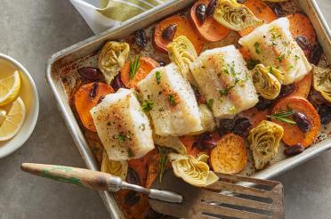 Sheet Pan Cod with Sweet Potatoes and Olives