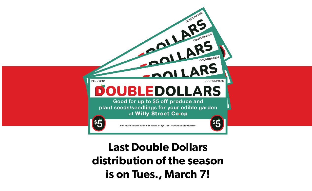 From roughly October through March of each year, any shopper using their FoodShare/QUEST card to purchase groceries is eligible to receive up to $20 worth of Double Dollars vouchers. These vouchers help purchase fresh, canned and frozen produce, and seeds and seedlings for growing edible plants. For more information, please see our Double Dollars page.