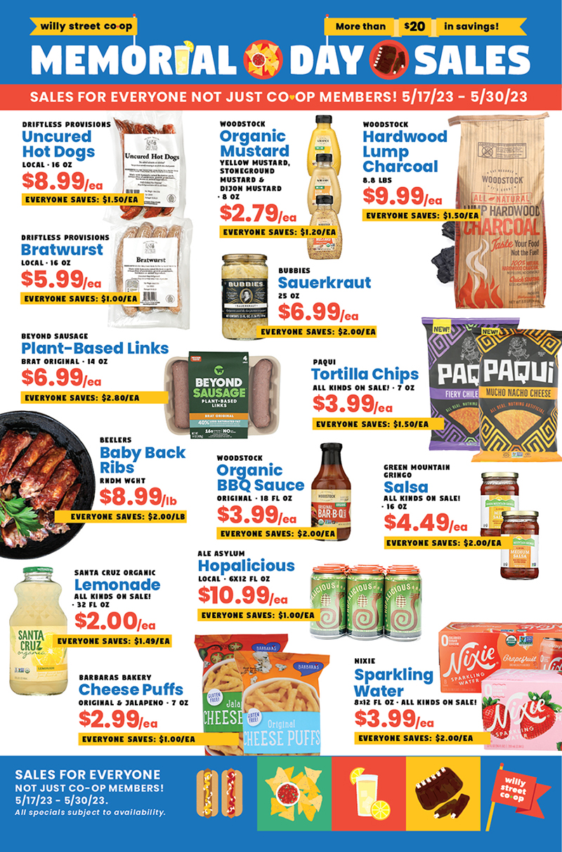 We have a selection of cookout-friendly products on sale for all customers May 17, 2023 through May, 30, 2023. There are meat and meat-free sausages, charcoal, condiments, chips, and beverages included—over $20 worth of savings! For more Co-op Deals sales (also for all customers), click here.