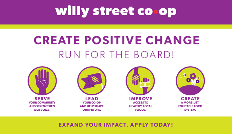 Interested in helping to guide the future of your Co-op? Run for a seat on the Board of Directors! Candidate applications are due August 29 at 3pm, and the election will be in October.