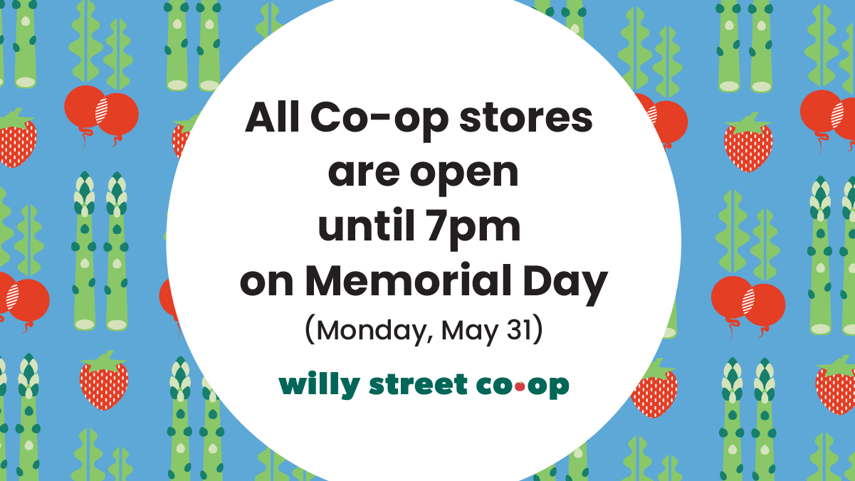 All Willy Street Co-op stores will be open until 7:00pm on Memorial day (Monday, May 31). Each store will open at their regular time that day.